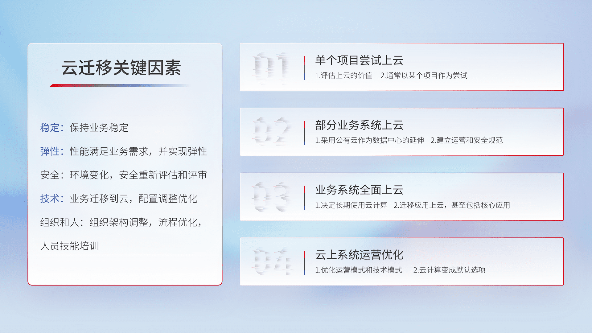 结合实际业务,,,从规划设计、、云平台选型、、、云原生改造、、、、数据迁移、、、集成交付,,迁移全过程为客户识别最佳上云路径,,,做好风险识别管理,,设计网络架构、、、身份权限、、安全审计合规、、、操作审计、、日志审计、、监控告警策略、、多站点容灾设计等,,,,对云上基础设施进行整体规划,,提升IT治理水平,,以满足弹性、、高可用、、高性能的需求。。。。