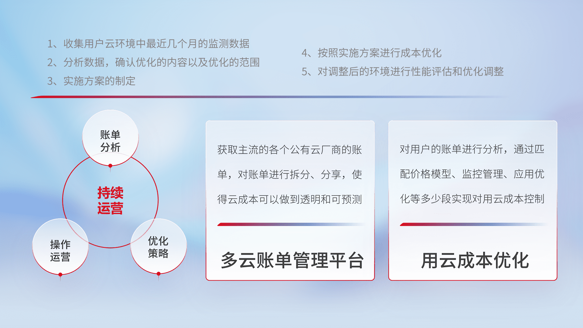 通过多云纳管,,以统一的资源数据模型把客户的云资源进行抽象和封装,,进而实现对多云资源的统一操作,,,,保障云资源管理的可靠性、、稳定性与可用性。。。。量身定制化运维内容,,,配置、、、开发运维、、补丁管理、、备份、、、、监控、、、、认证和访问管理、、、、审计和日常巡检等,,保障在用云过程中的可靠度,,稳定度以及高可用率。。。