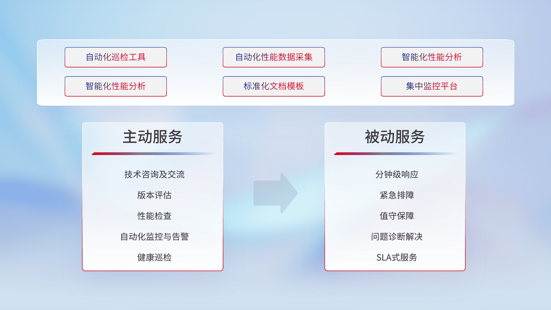 智能化工具和标准化文档,,保障服务质量,,提供主动服务(包含技术咨询、、版本评估、、、性能检查、、、、自动化监控与告警、、健康巡检)和被动服务包含(分钟级响应、、、、紧急排障、、、值守保障、、问题诊断解决、、SLA服务)。。。。